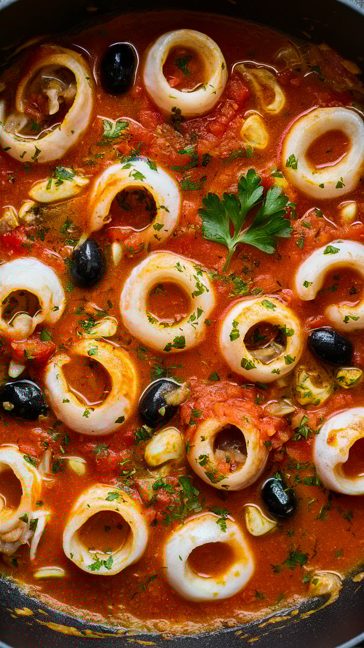 This vibrant seafood recipe fuses tender calamari with the punchy, aromatic notes of classic Puttanesca sauce — a lively mix of tomatoes, garlic, olives, capers, anchovies, and chili.