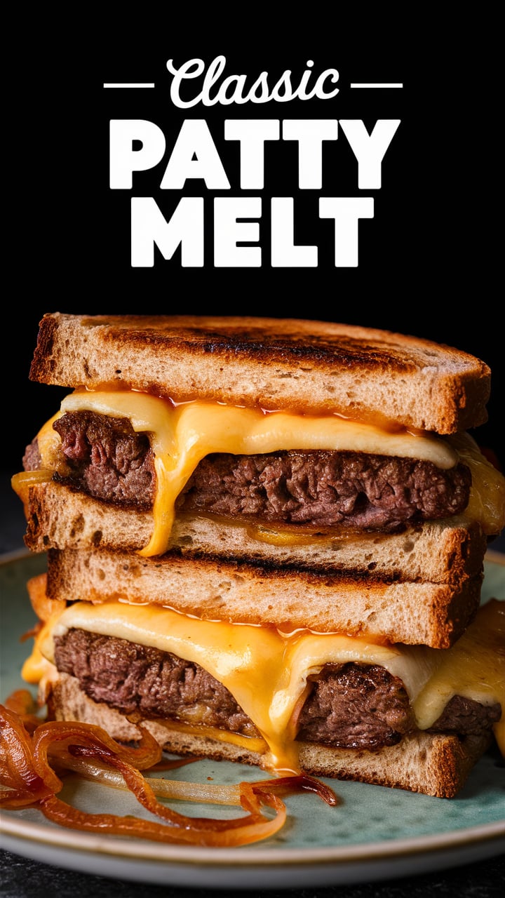 A classic patty melt combines a juicy ground beef patty, caramelized onions, and melted cheese between two slices of buttered rye bread — grilled until golden and crisp. It’s the perfect fusion of a cheeseburger and a grilled cheese sandwich, capturing the nostalgic flavor of an old-school diner favorite.